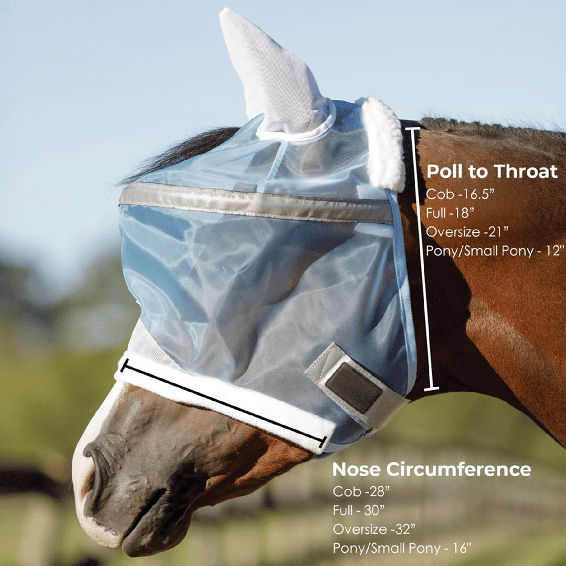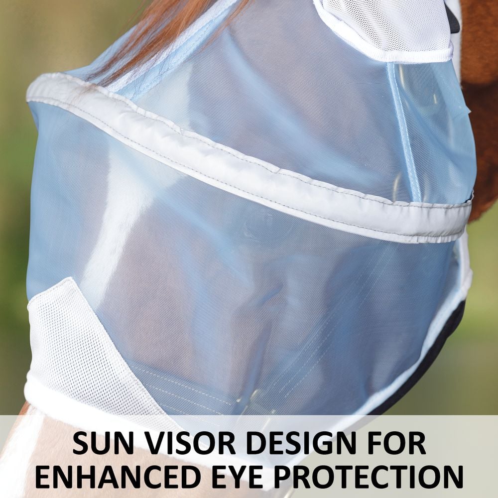 You can choose this mask to include an extended nosepiece for extra coverage and protection against pesky insects and unwanted sunburns. The nosepiece is tapered and shaped to fit the contoured design of your horse's muzzle and does not interfere with grazing or airflow.